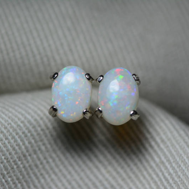 Australian Opal Earrings, 0.91 Carat Natural Solid Cabochon Opal Studs, 7x5mm Oval Cab, Australia, October Birthstone, Rainbow Fire
